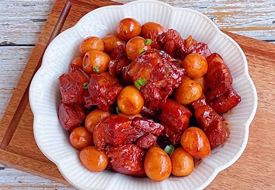 肉煮好后,將鵪鶉蛋放進去,再加鹽調味,轉大火翻炒收汁,就可以出鍋了。
